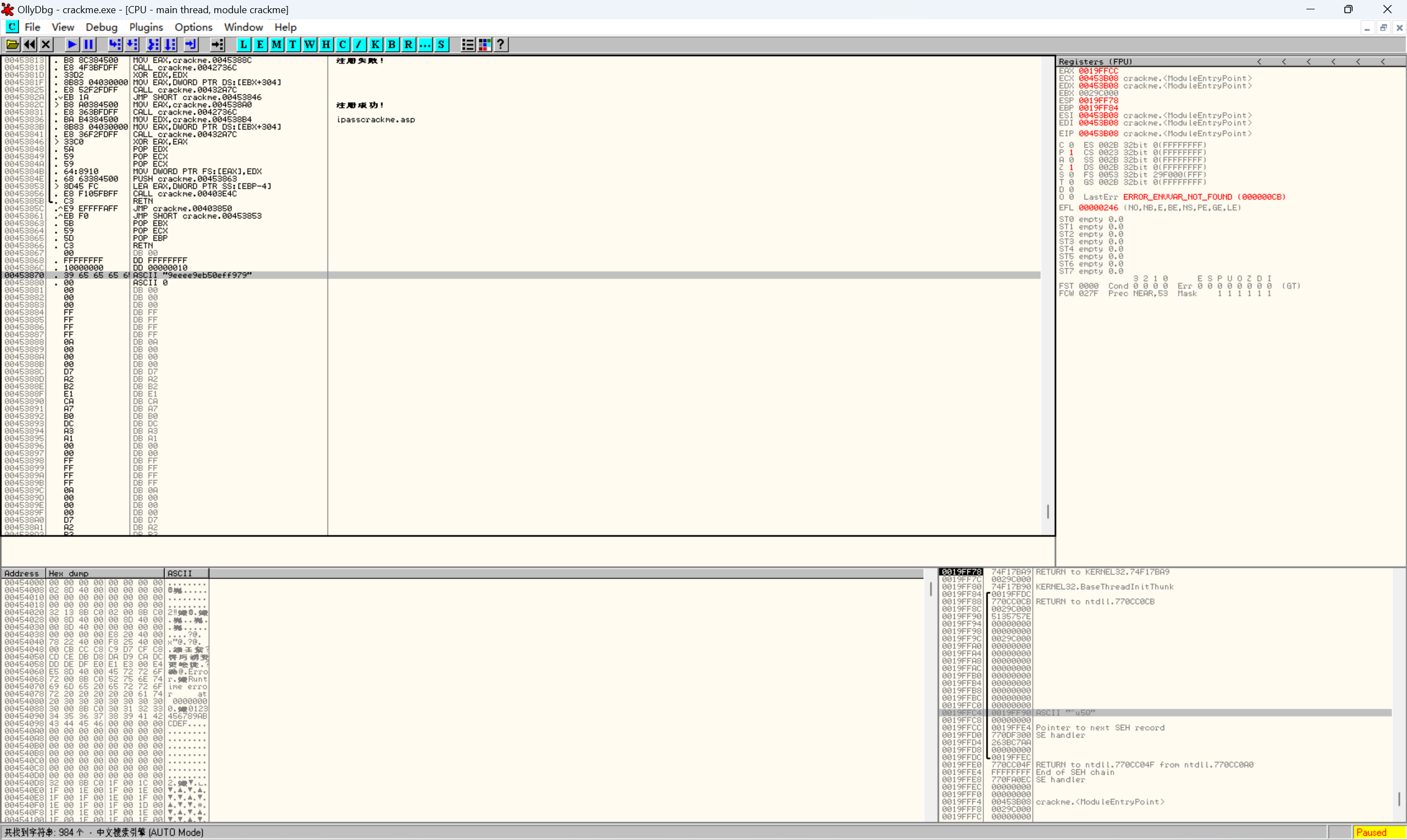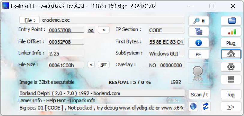 该图片显示的是使用 Exeinfo PE 工具分析的一个名为 crackme.exe 的可执行文件的详细信息: