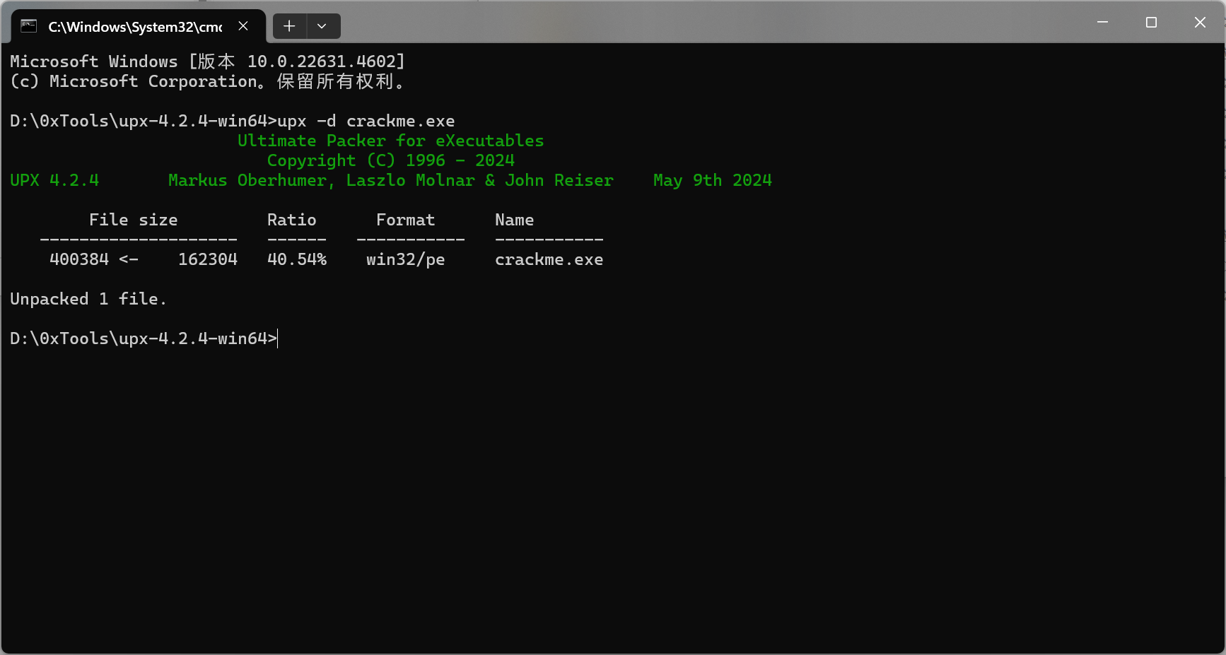 意味着可通过UPX工具自身使用 upx.exe -d crackme.exe 命令进行“脱壳”操作,将文件还原回未压缩状态,便于进一步静态分析或逆向工程。