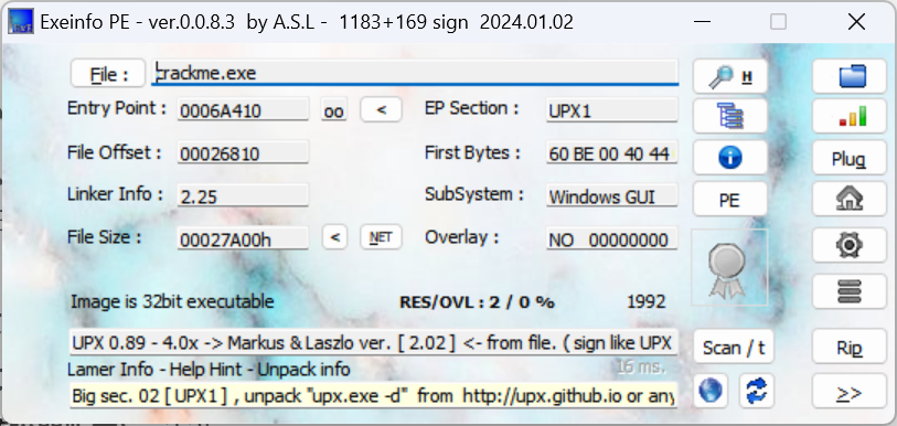 - 检测到UPX壳,具体版本区间:UPX 0.89 - 4.0x (此文件实际匹配UPX 2.02特征)。