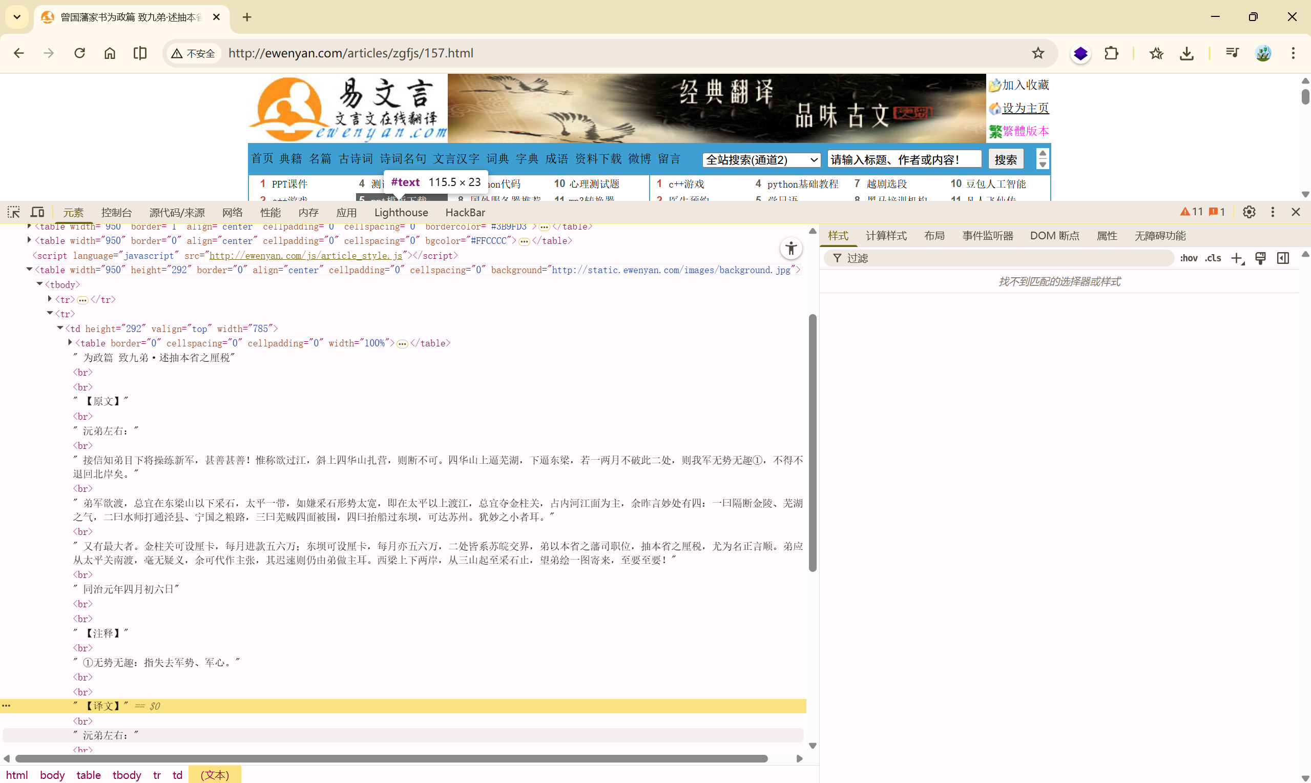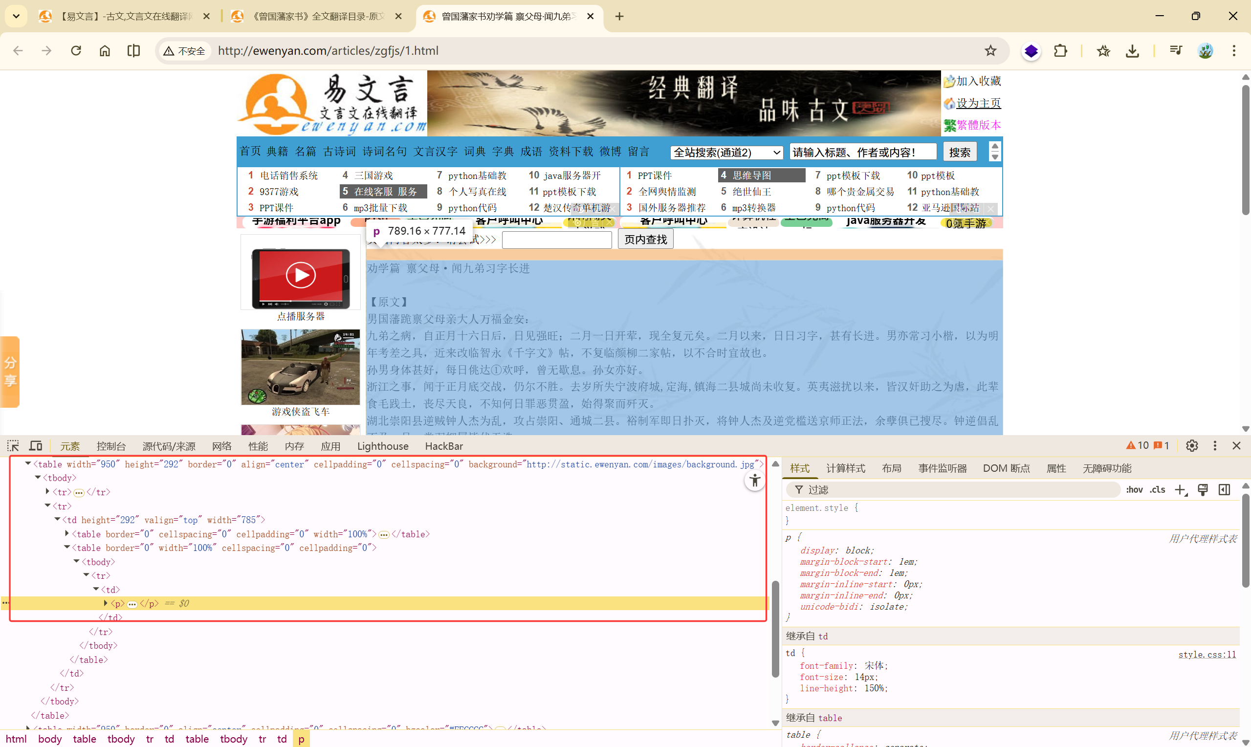 因为此网站的文章数据全部放在<p>标签内,并且页面布局都是以<table>标签来布局的。