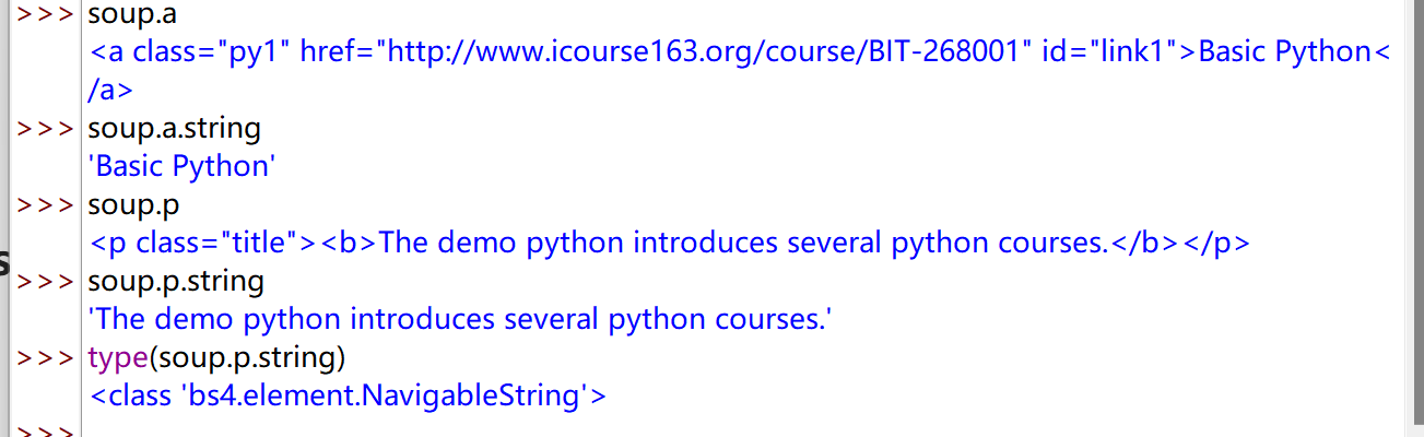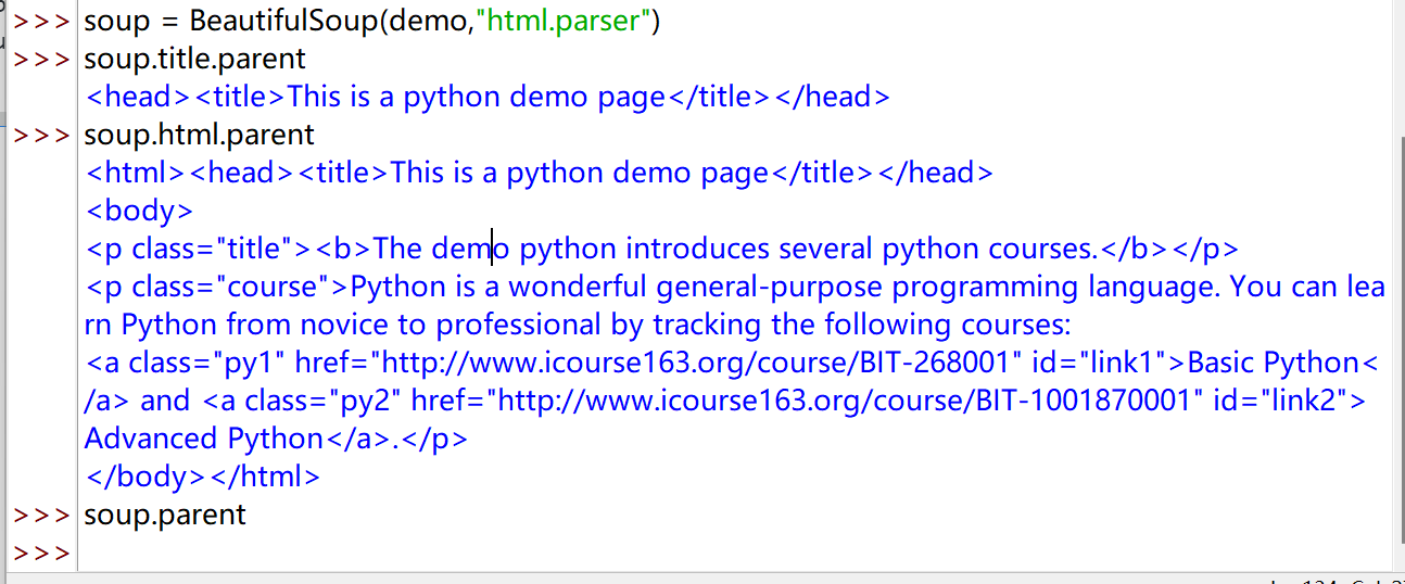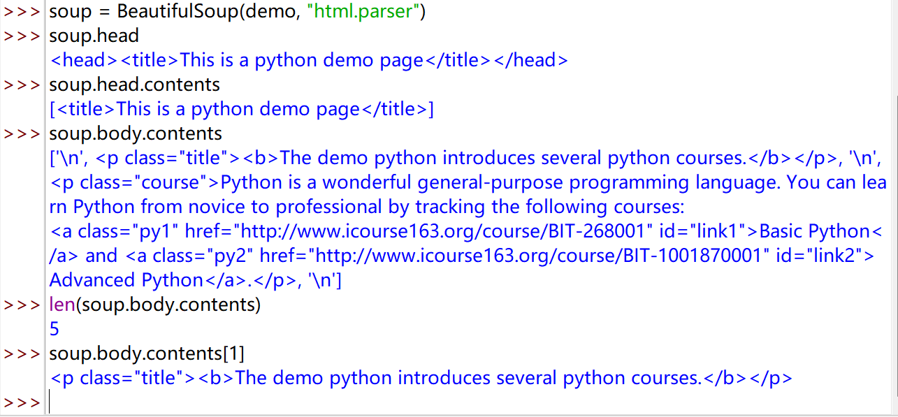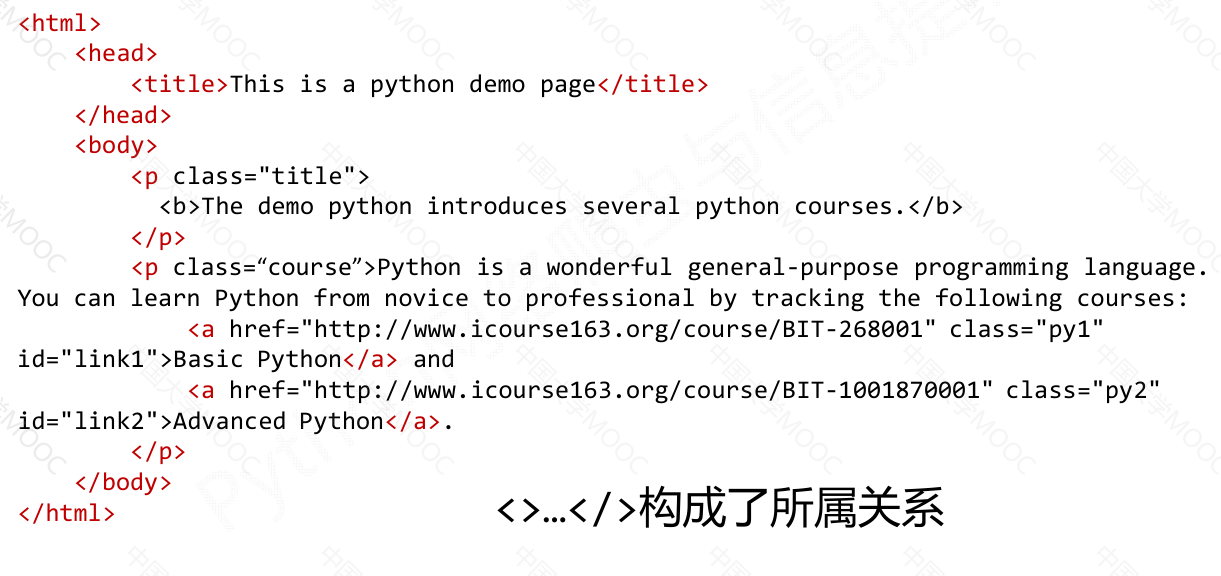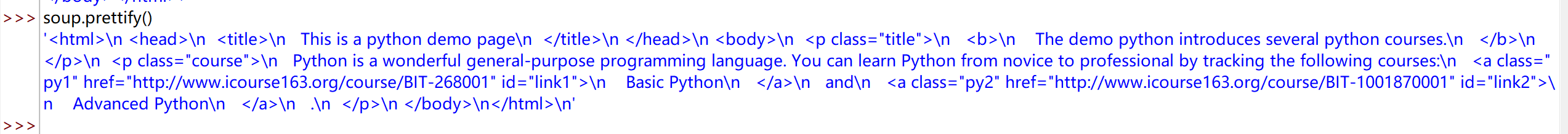 '<html>\n <head>\n <title>\n This is a python demo page\n </title>\n </head>\n <body>\n <p class="title">\n <b>\n The demo python introduces several python courses.\n </b>\n </p>\n <p class="course">\n Python is a wonderful general-purpose programming language. You can learn Python from novice to professional by tracking the following courses:\n <a class="py1" href="http://www.icourse163.org/course/BIT-268001" id="link1">\n Basic Python\n </a>\n and\n <a class="py2" href="http://www.icourse163.org/course/BIT-1001870001" id="link2">\n Advanced Python\n </a>\n .\n </p>\n </body>\n</html>\n'