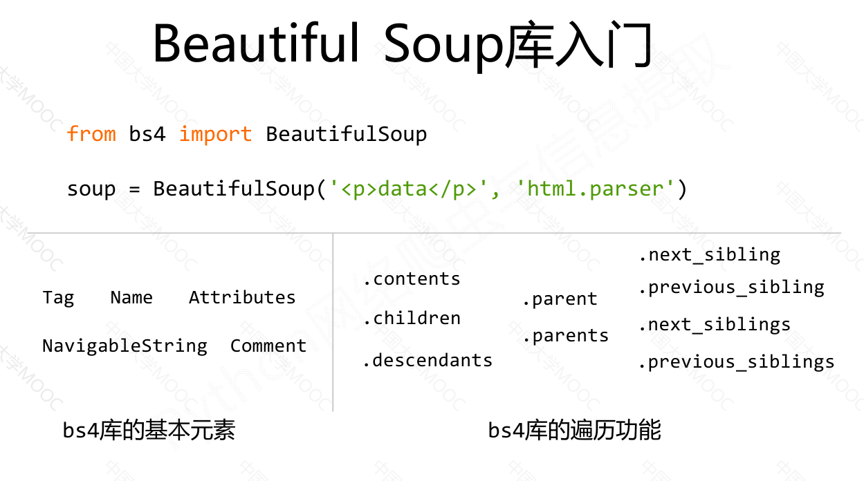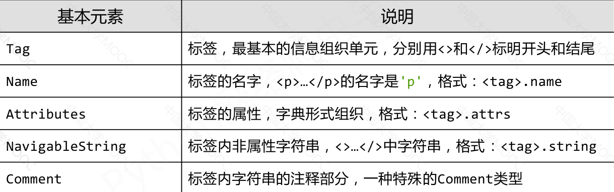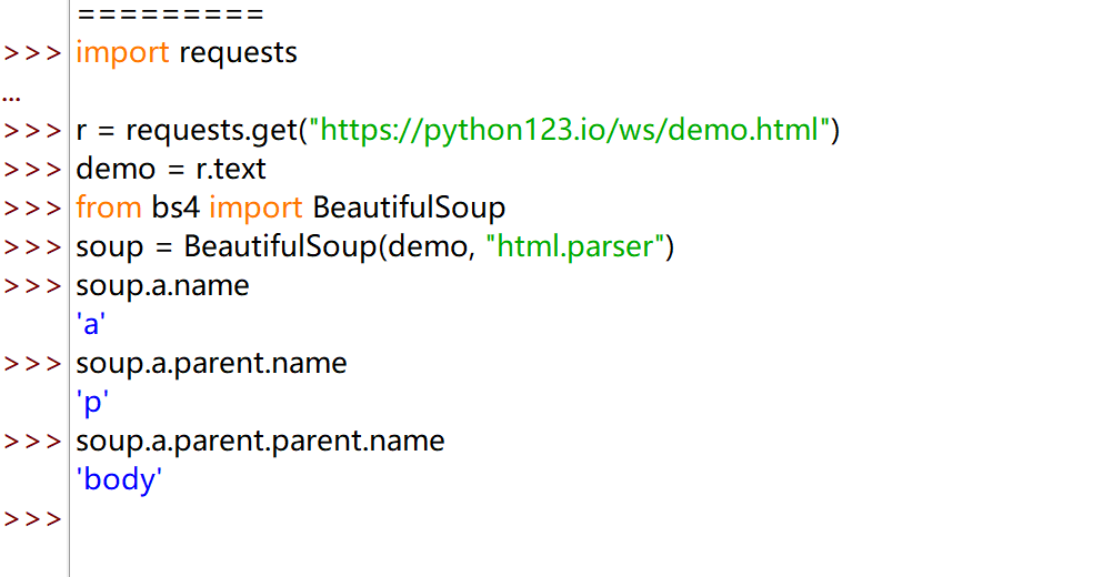 任何存在于 HTML 语法中的标签都可以用**soup.<tag>**访问获得,当 HTML 文档中存在多个相同<tag>对应内容时,soup.<tag>返回第一个