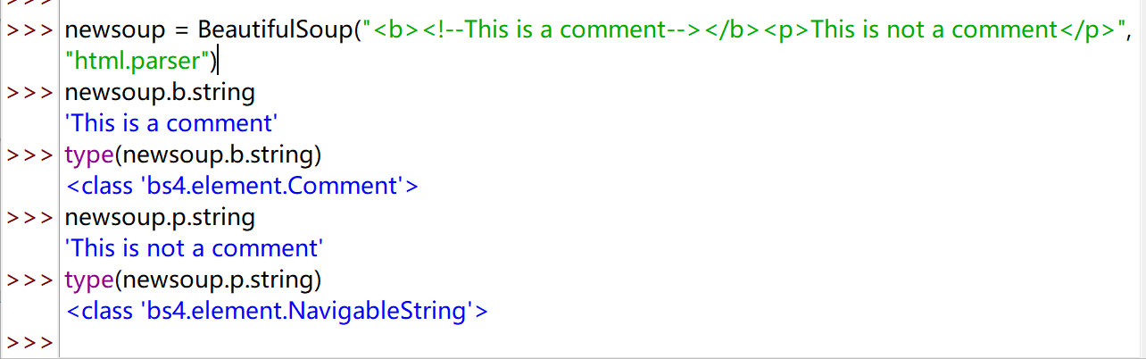 | newsoup = BeautifulSoup("<b><!--This is a comment--></b><p>This is not a comment</p>", "html.parser")