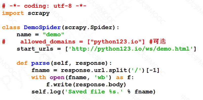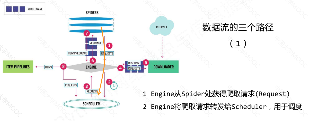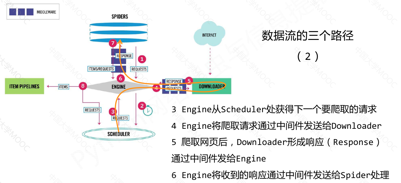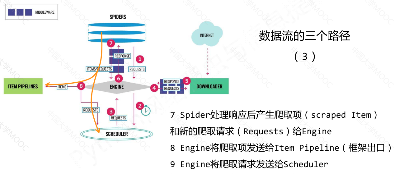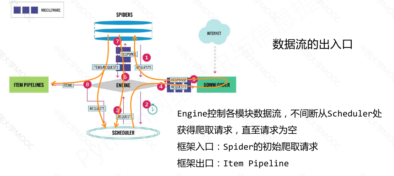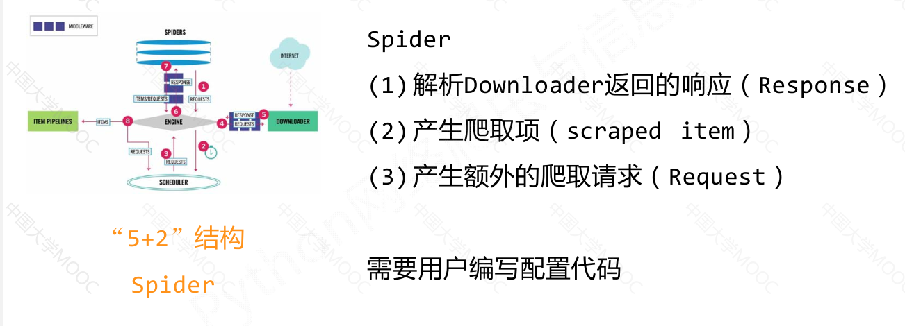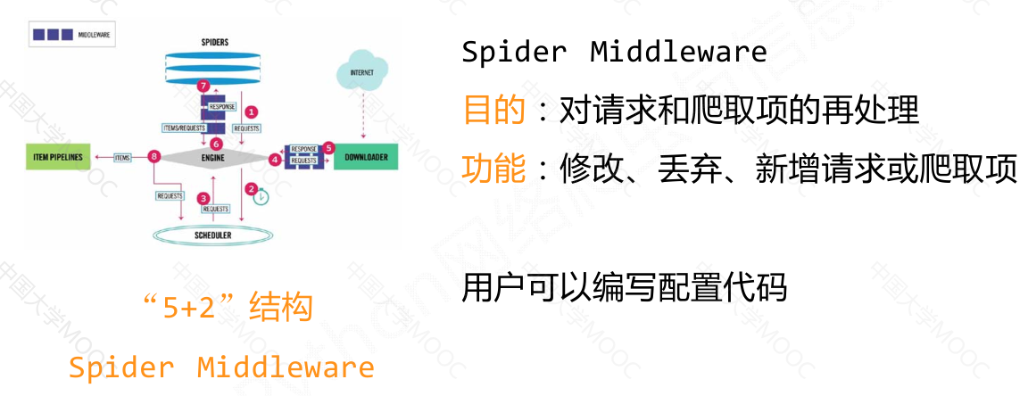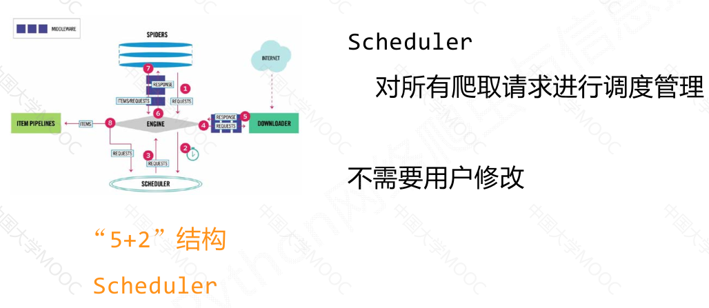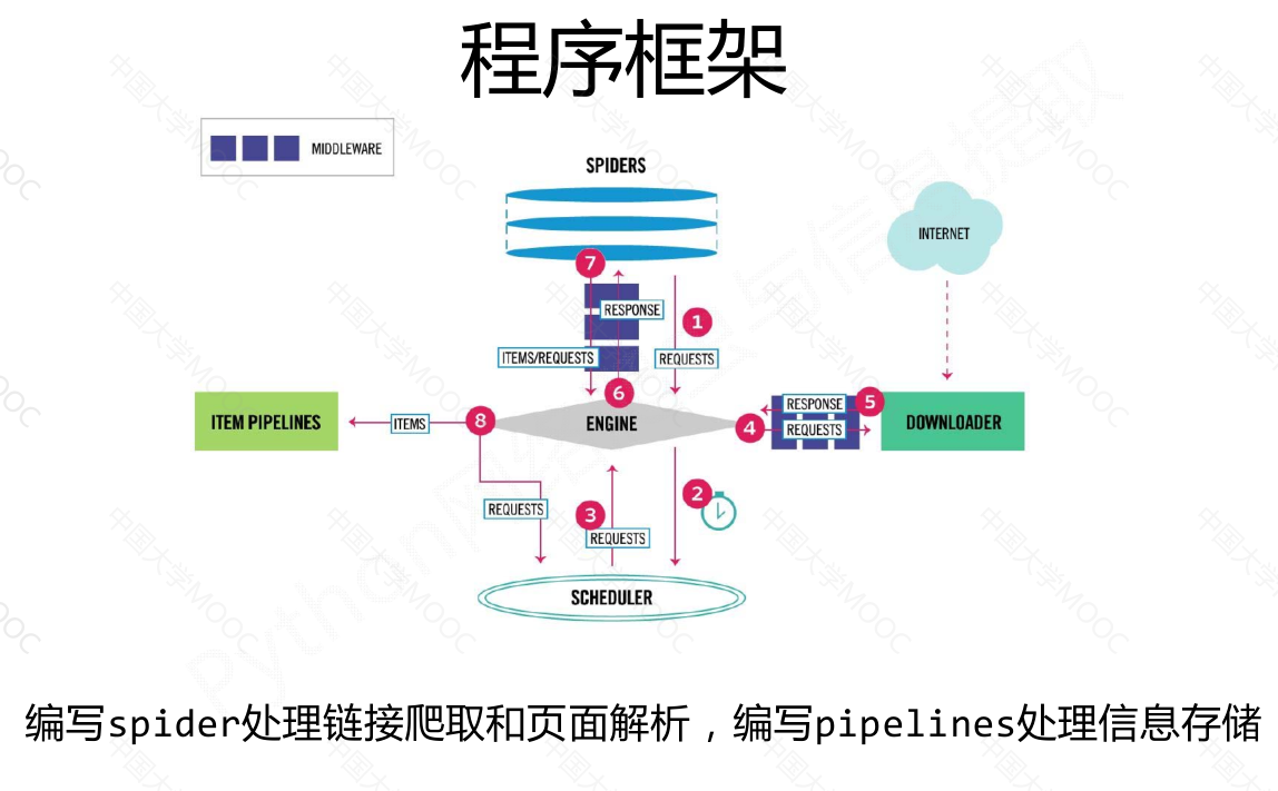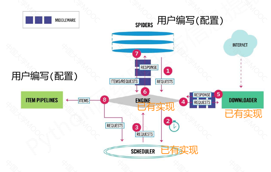 用户主要需要编写spider模块和item pipelines模块的相关代码,可以通过中间键对请求、响应和爬取项进行操作和配置。