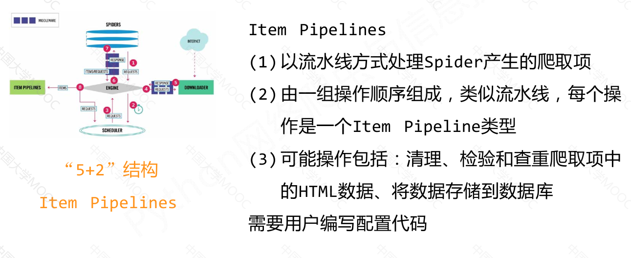 item pipelines模块以流水线的方式处理爬取项,对数据进行清理、检验、查重等操作。