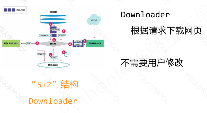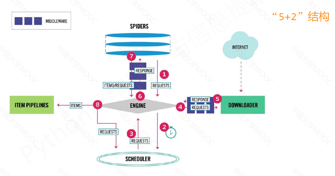 Scrapy 爬虫框架是一个包含5个主要模块和2个中间键的框架。其中,
