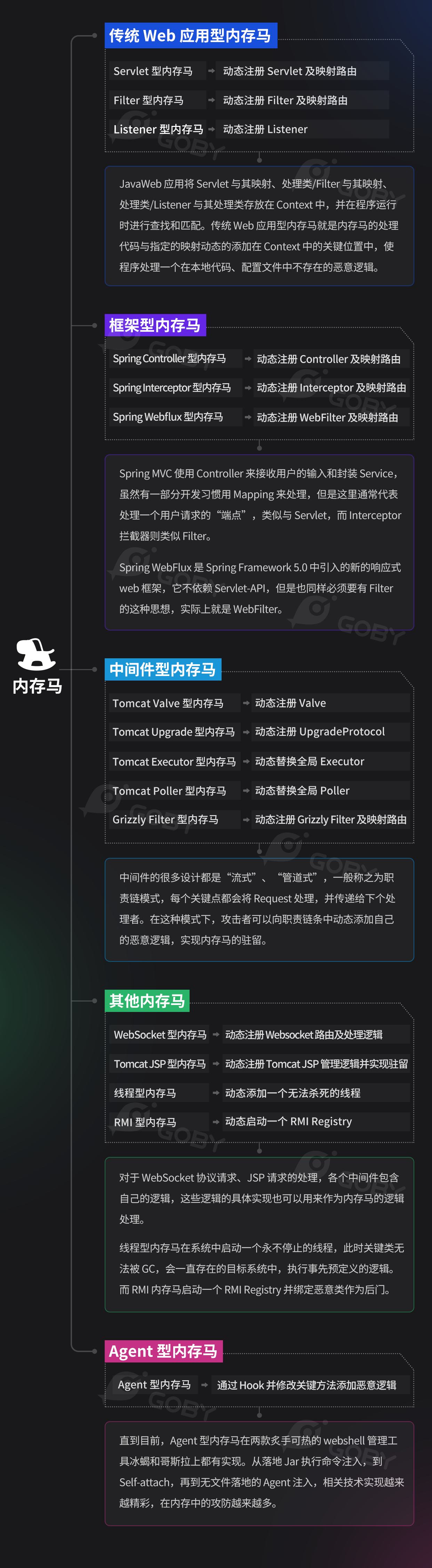 内存马又名无文件马,见名知意,也就是无文件落地的 webshell 技术,是由于 webshell 特征识别、防篡改、目录监控等等针对 web 应用目录或服务器文件防御手段的介入,导致的文件 shell 难以写入和持久而衍生出的一种“概念型”木马。这种技术的核心思想非常简单,一句话就能概括,那就是对访问路径映射及相关处理代码的动态注册。