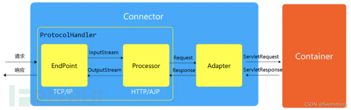 简单来说就是Connector将在某个指定的端口上来监听客户的请求,将 socket 连接封装成 request 和 response 对象,后续交给 Container (Engine)来处理,并从Engine处获得响应并返回给客户端。