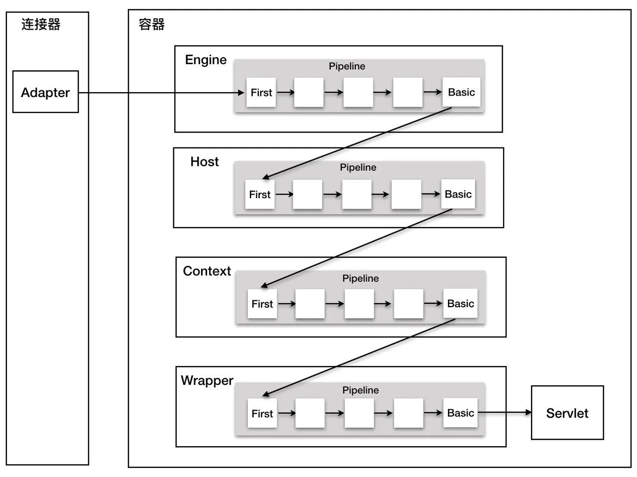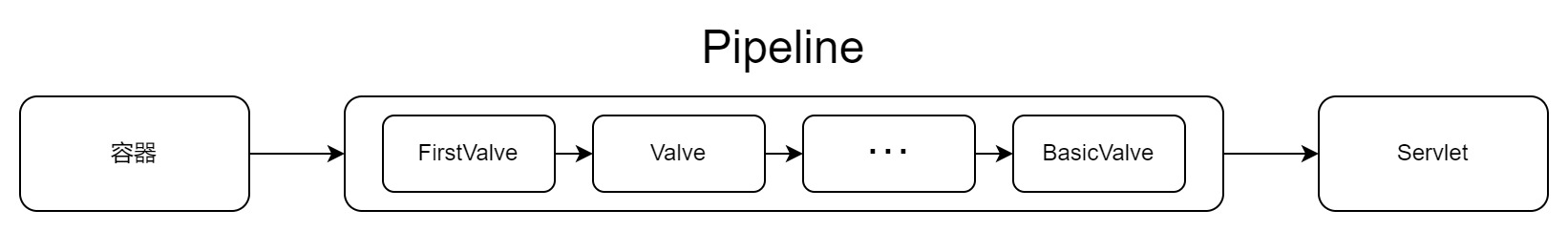 Connector进行解析,然后发送到Container进行处理。那么我们的消息又是怎么在四类子容器中层层传递,最终送到Servlet进行处理的呢?这里涉及到的机制就是Tomcat管道机制。管道机制主要涉及到两个名词,Pipeline(管道)和Valve(阀门)。如果我们把请求比作管道(Pipeline)中流动的水,那么阀门(Valve)就可以用来在管道中实现各种功能,如控制流速等。因此通过管道机制,我们能按照需求,给在不同子容器中流通的请求添加各种不同的业务逻辑,并提前在不同子容器中完成相应的逻辑操作。这里的调用流程可以类比为Filter中的责任链机制
