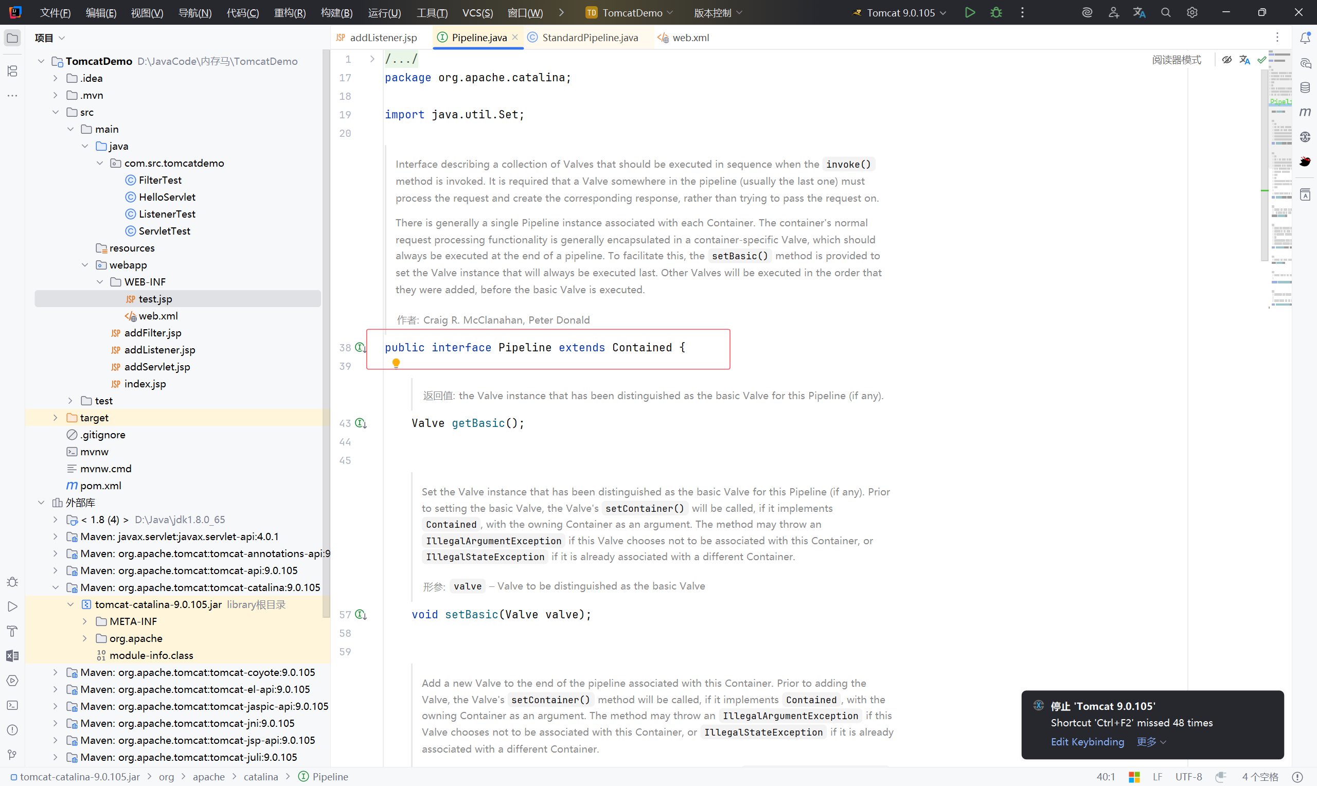 我们先来看看Pipeline接口,其继承了Contained接口,并且实现了很多对 Valve 的操作方法