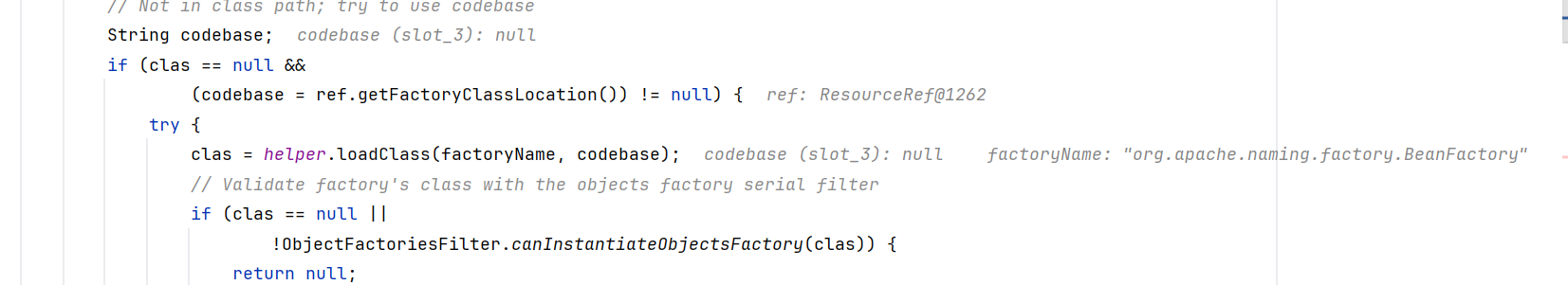 前面的流程还是进入 lookup 方法,到 RegistryContext 类的 decodeObject() 方法,这个方法当中调用了 getObjectInstance()。然后来到 getObjectFactoryFromReference 开始跟:
