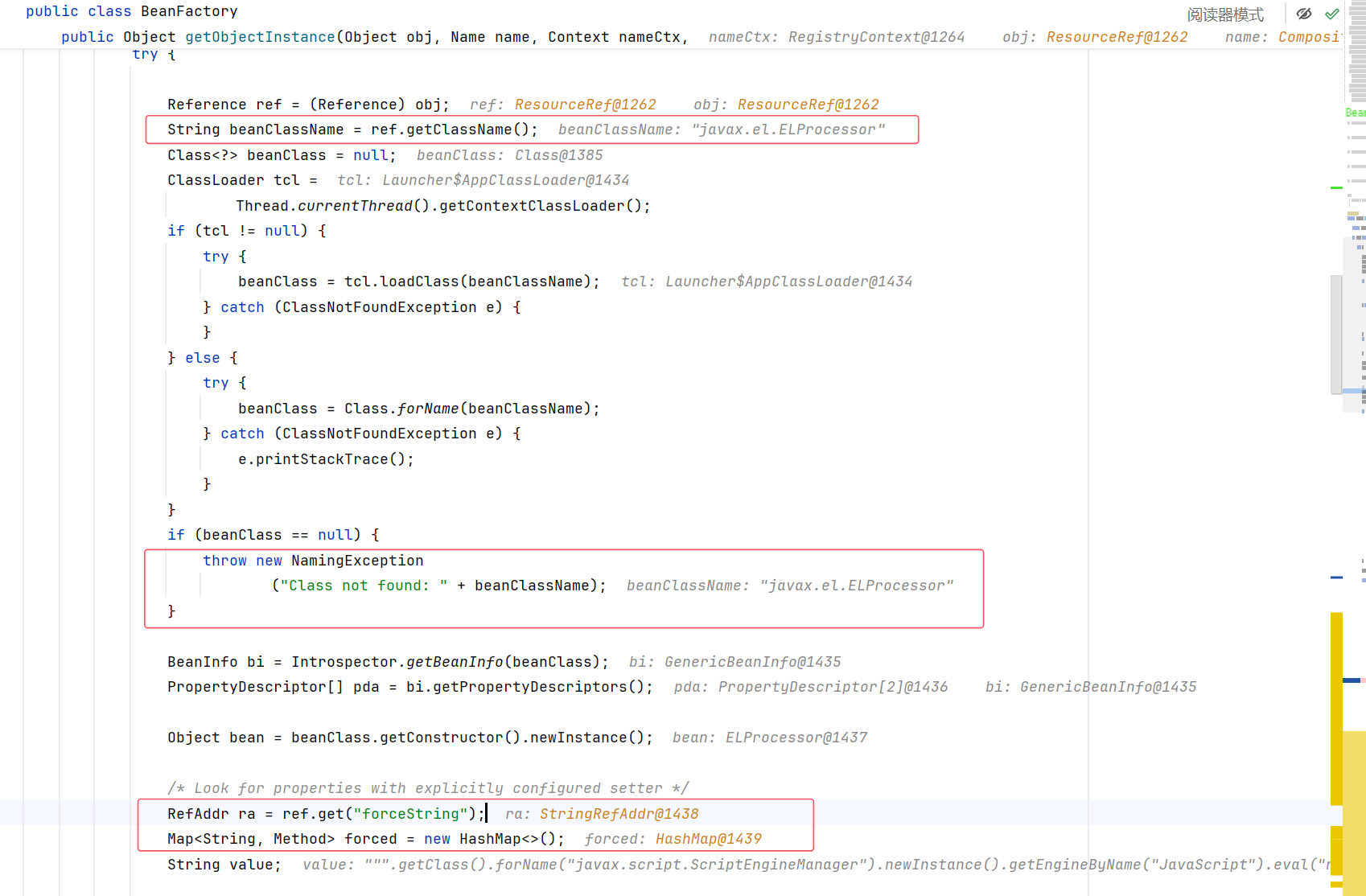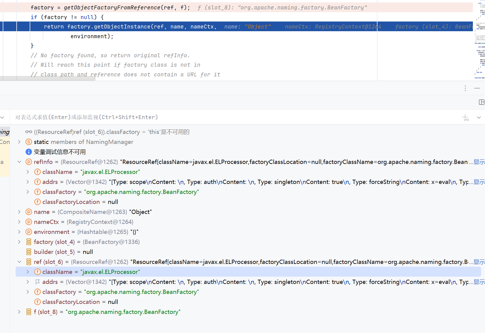 然后经过一系列复杂的赋值,最终在 ref 的 className 中获取到了 “javax.el.ELProcessor” ,classFactory 获取到了"org.apache.naming.factory.BeanFactory"