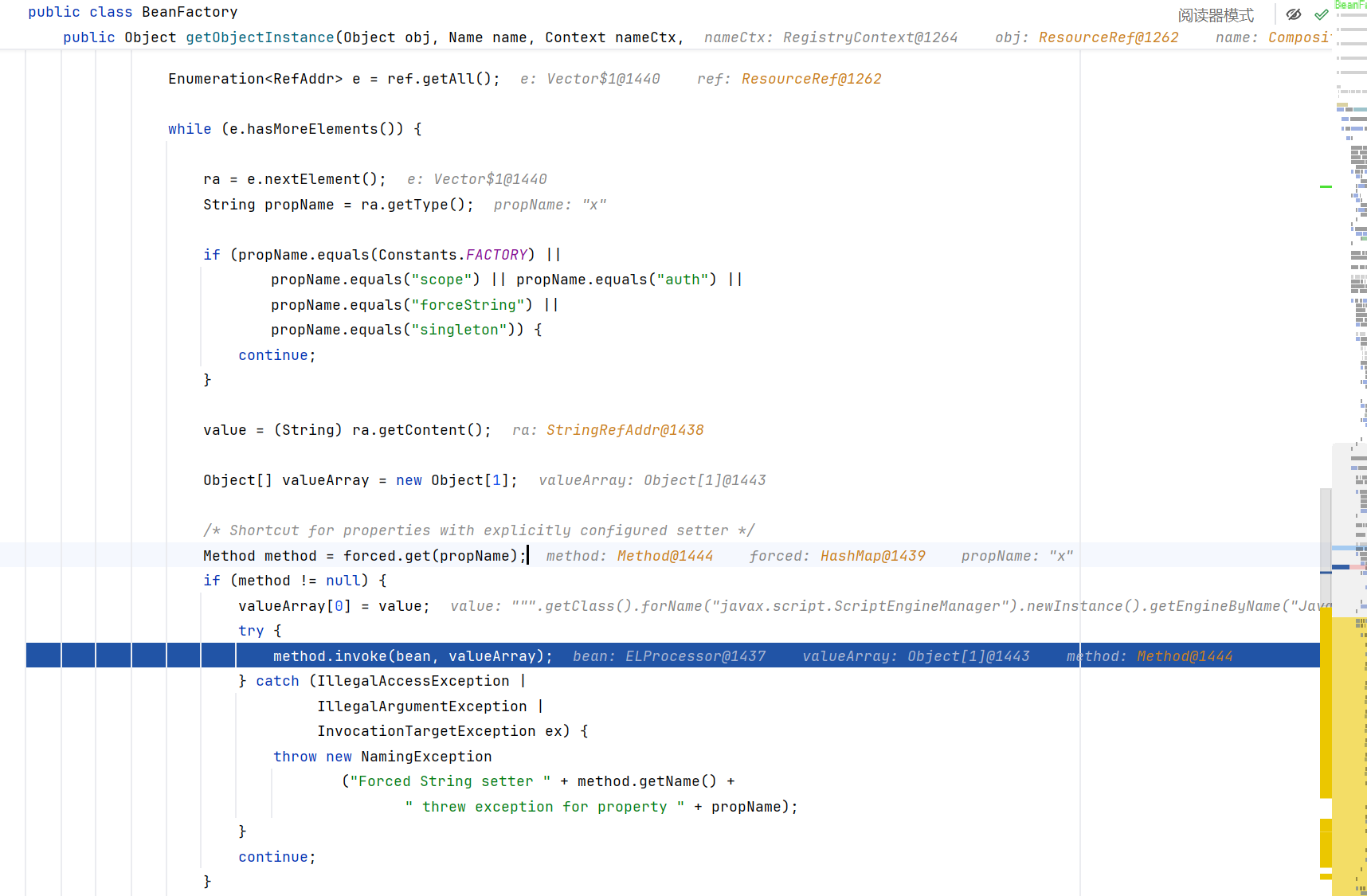 到了 getObjectInstance 之后便是整理变量,准备执行 invoke 方法