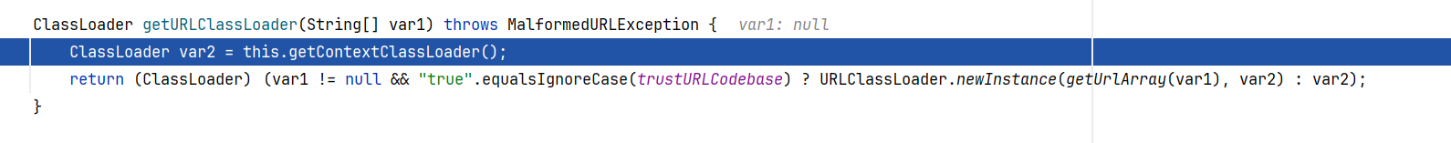 getURLClassLoader 中的 trustURLCodebase 默认是 false ,不执行 newInstance 实例化,这里虽然已经获取到字节码了,只是不实例化就无法加载,也就无法命令执行。