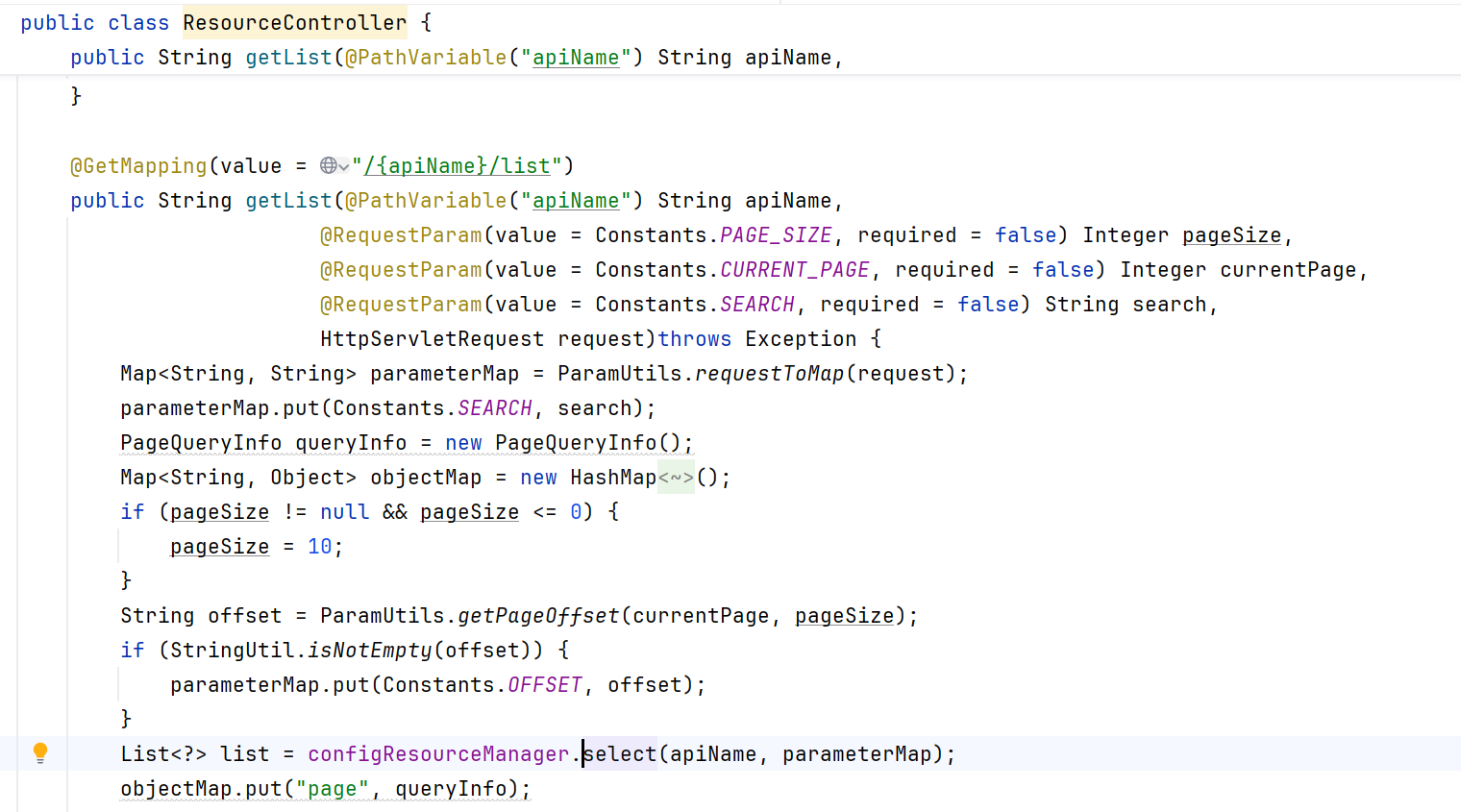 List<?> list = configResourceManager.select(apiName, parameterMap);