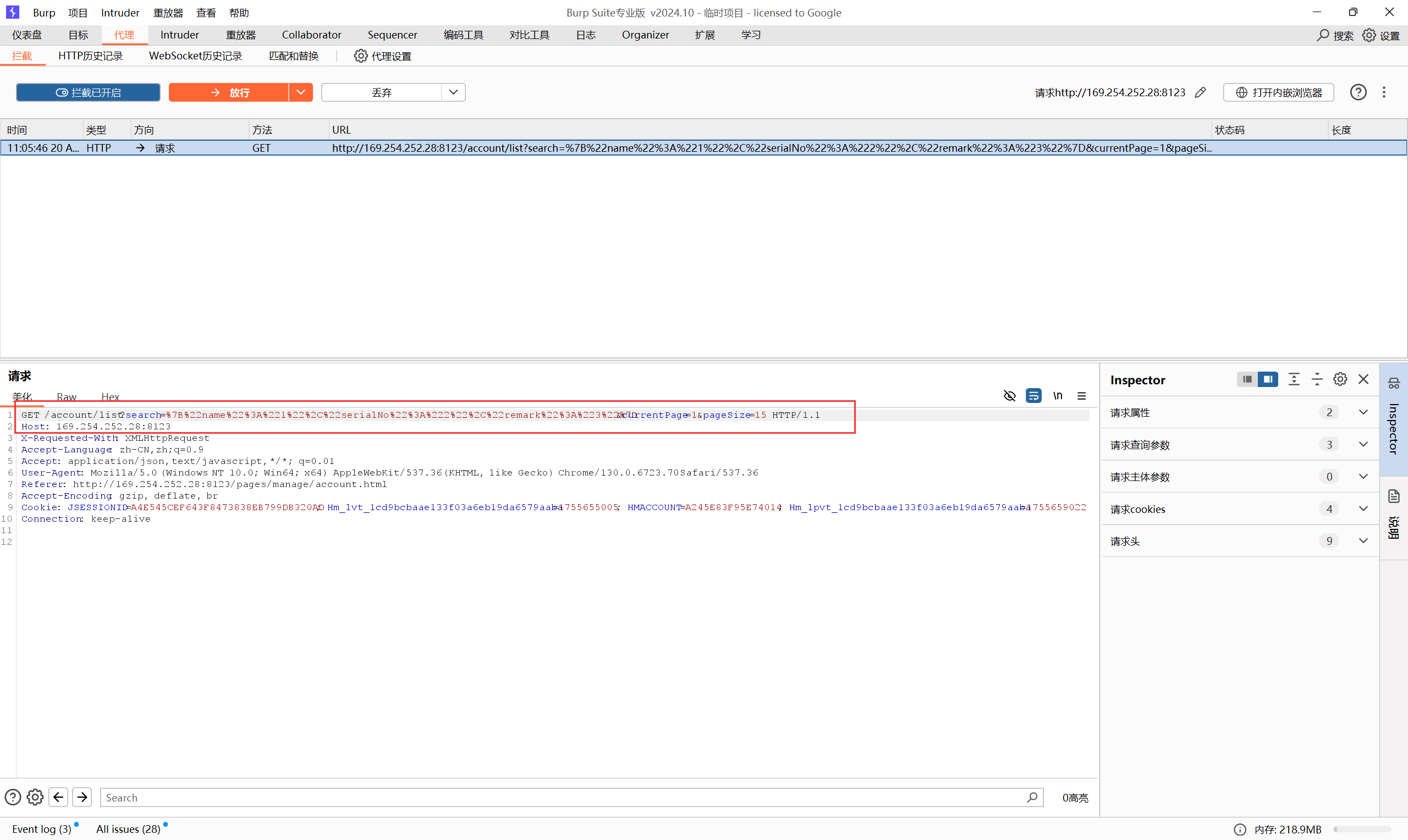 | GET /account/list?search=%7B%22name%22%3A%221%22%2C%22serialNo%22%3A%222%22%2C%22remark%22%3A%223%22%7D¤tPage=1&pageSize=15 HTTP/1.1