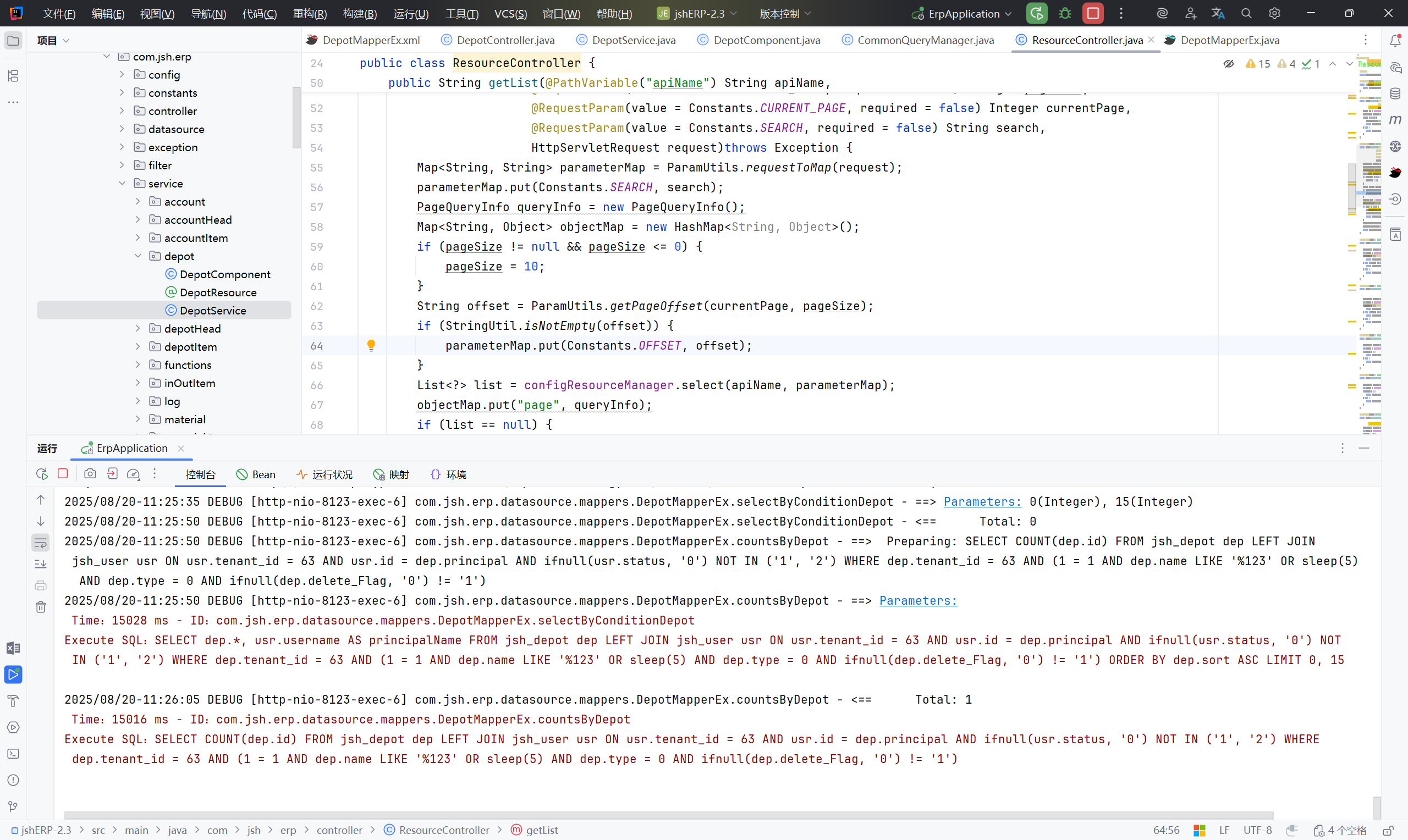 list=depotMapperEx.selectByConditionDepot(name, type, remark, offset, rows);